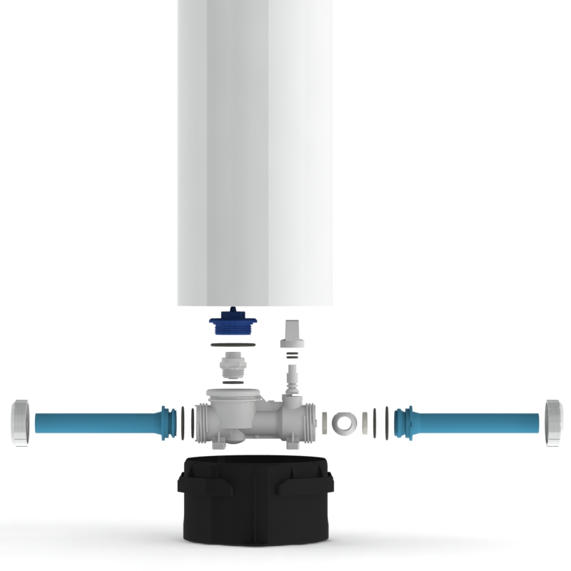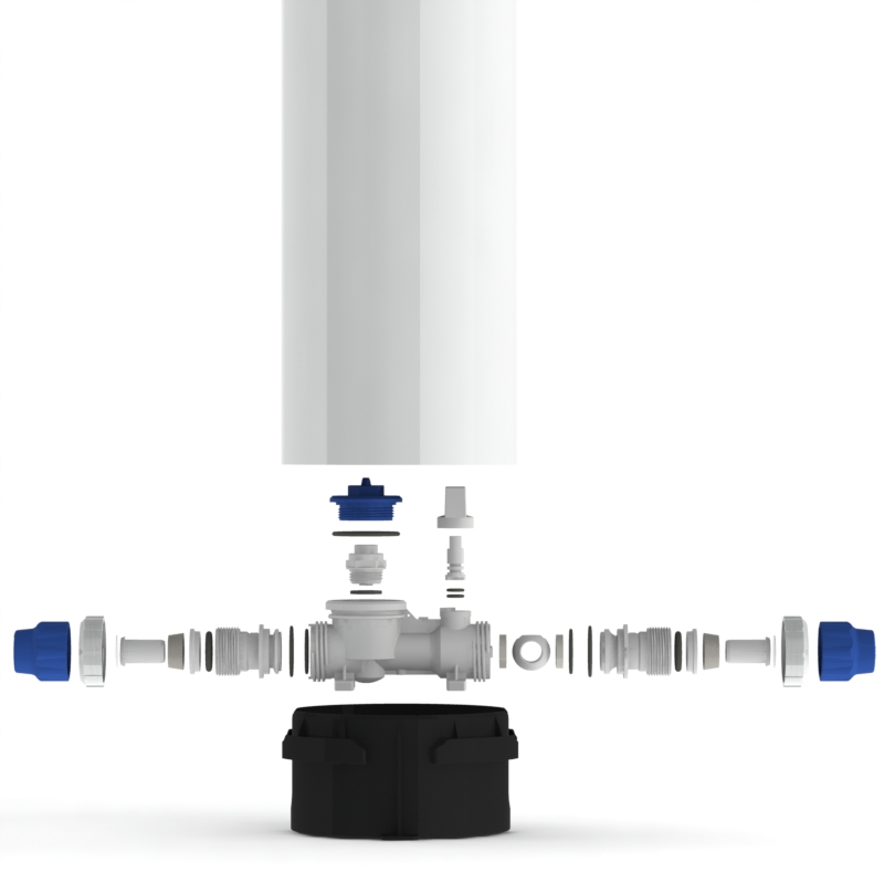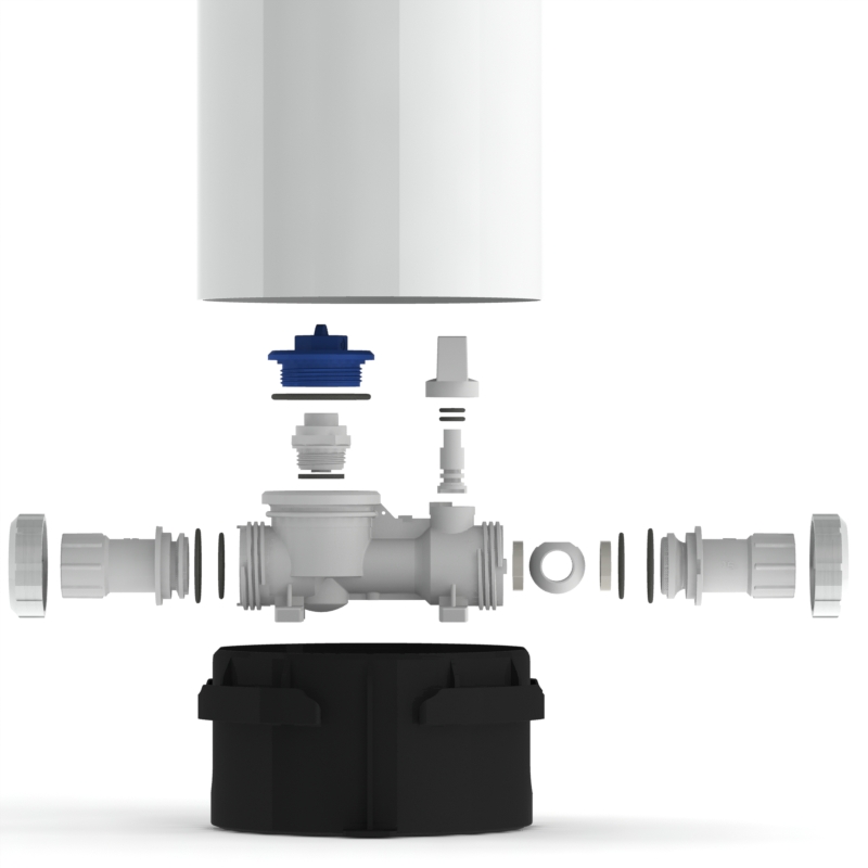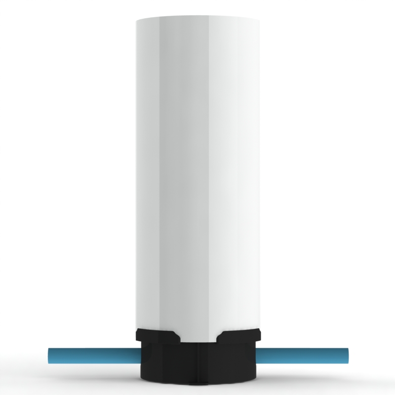 Features injection moulded MDPE pipe inlet and outlet to connect direct to adaptors.